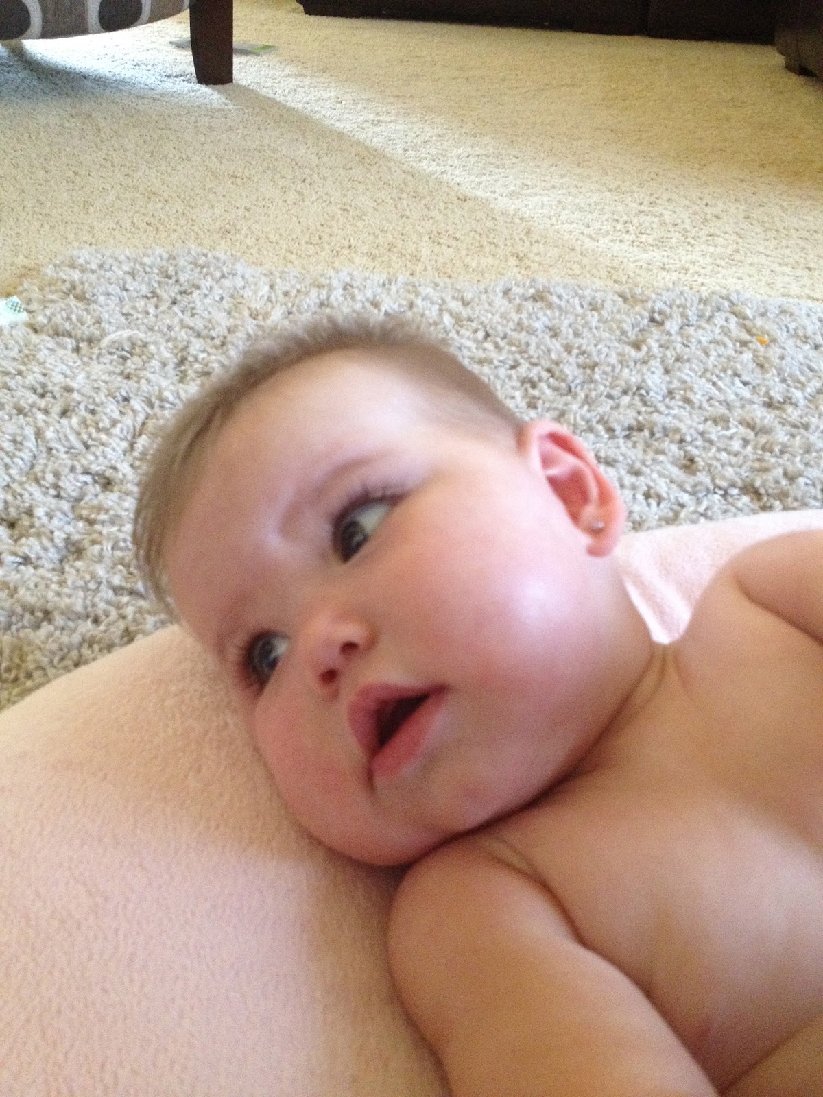 She still will not roll from her back to front and won't push herself up while on tummy time. Ugh! I swear, the girl is not going to crawl if she won't stay on her stomach long enough to push herself up.